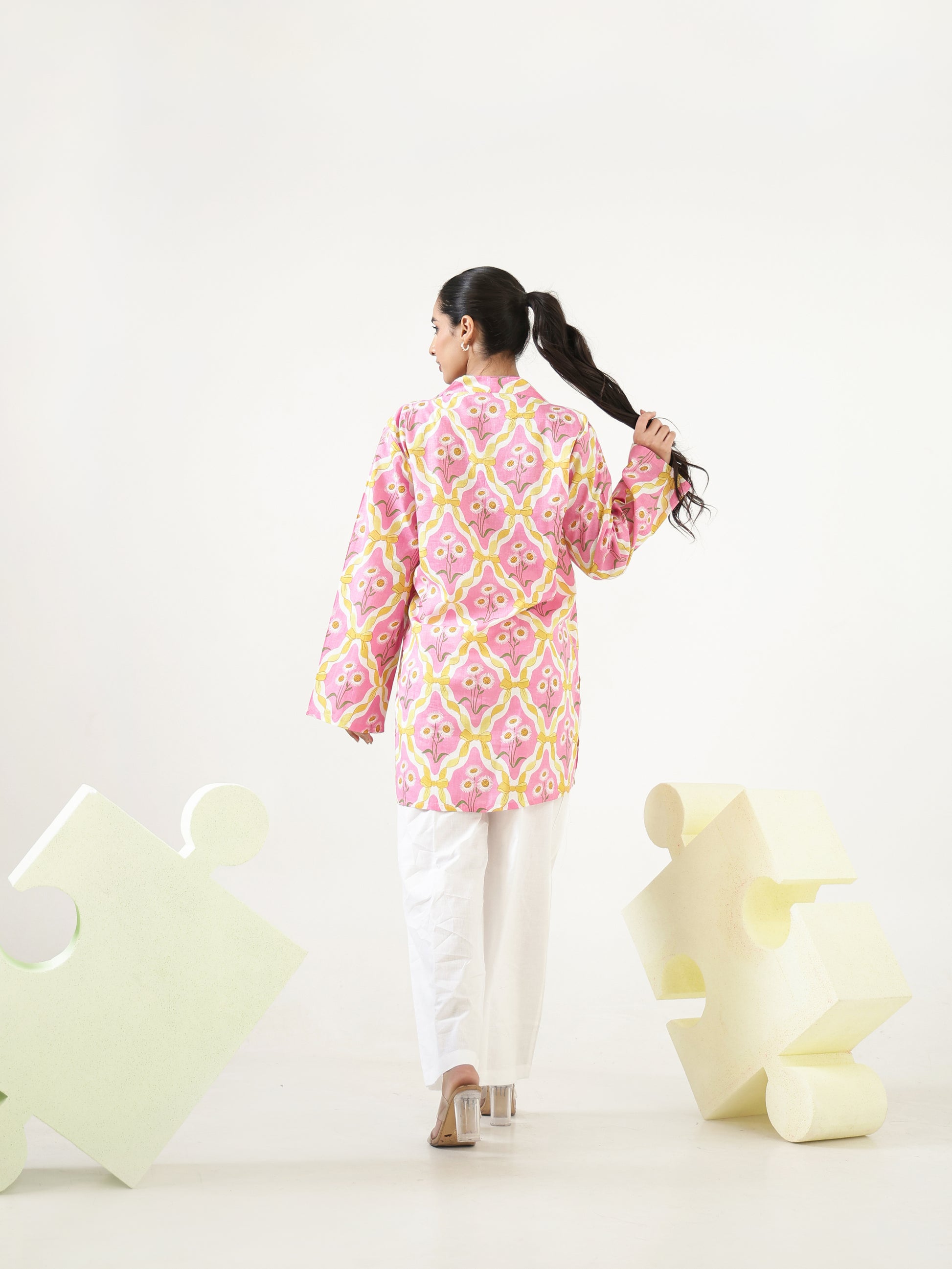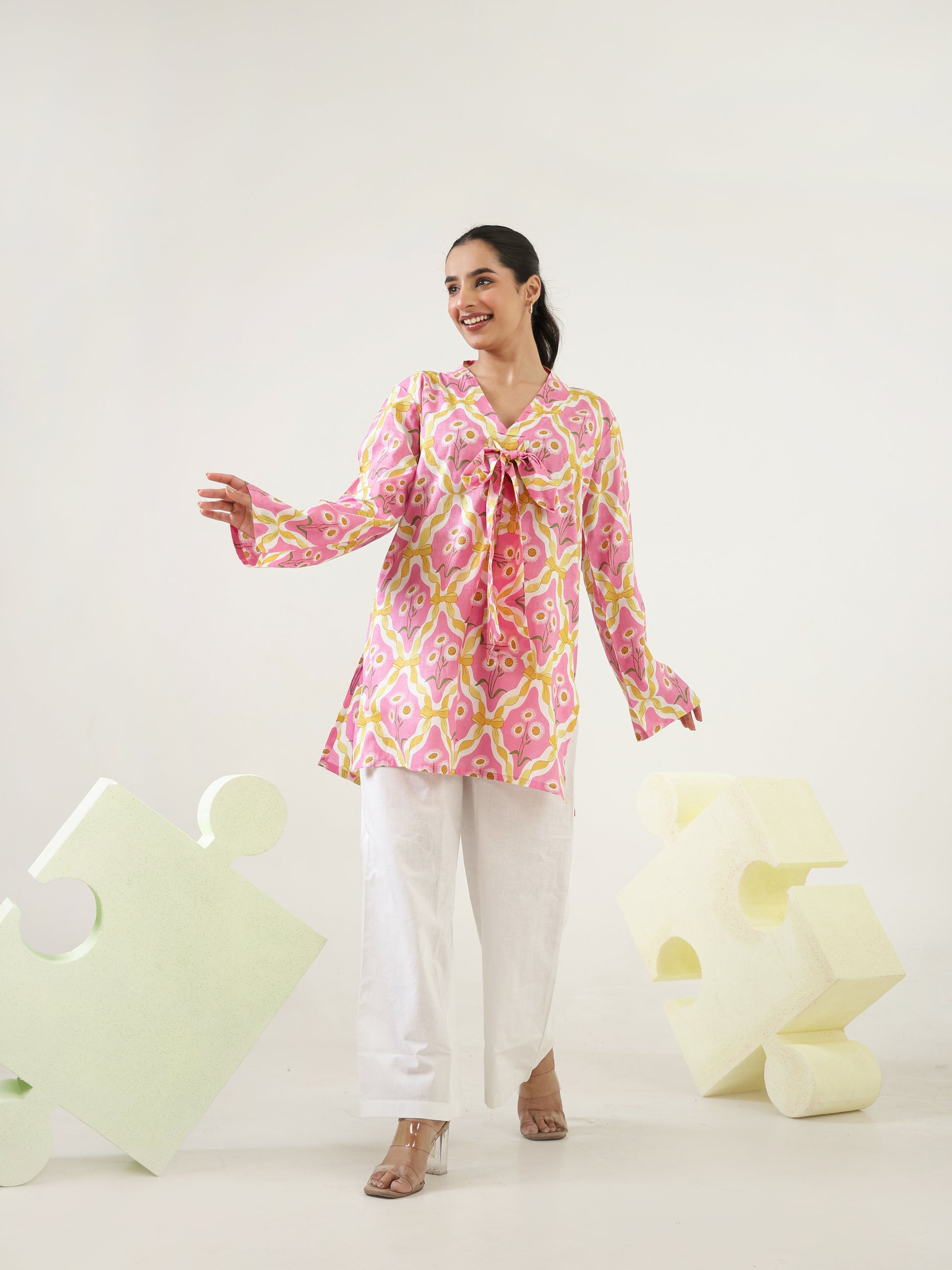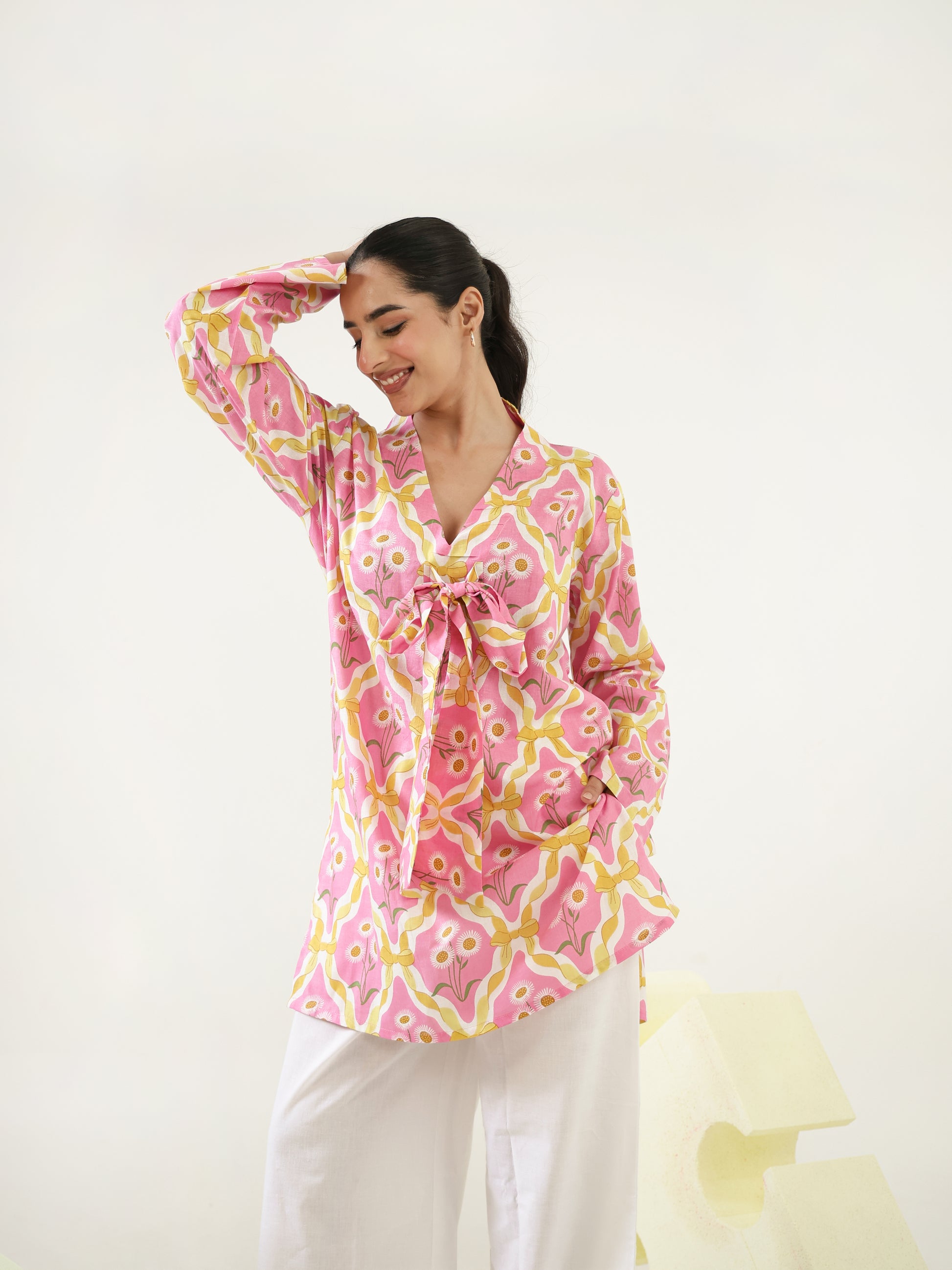 Designed in a soft pink floral-inspired print, this cotton co-ord set features a relaxed tunic-style top with full sleeves and charming tie-up detailing at the neckline. Paired with white pants, the set blends breathable comfort with effortless elegance.