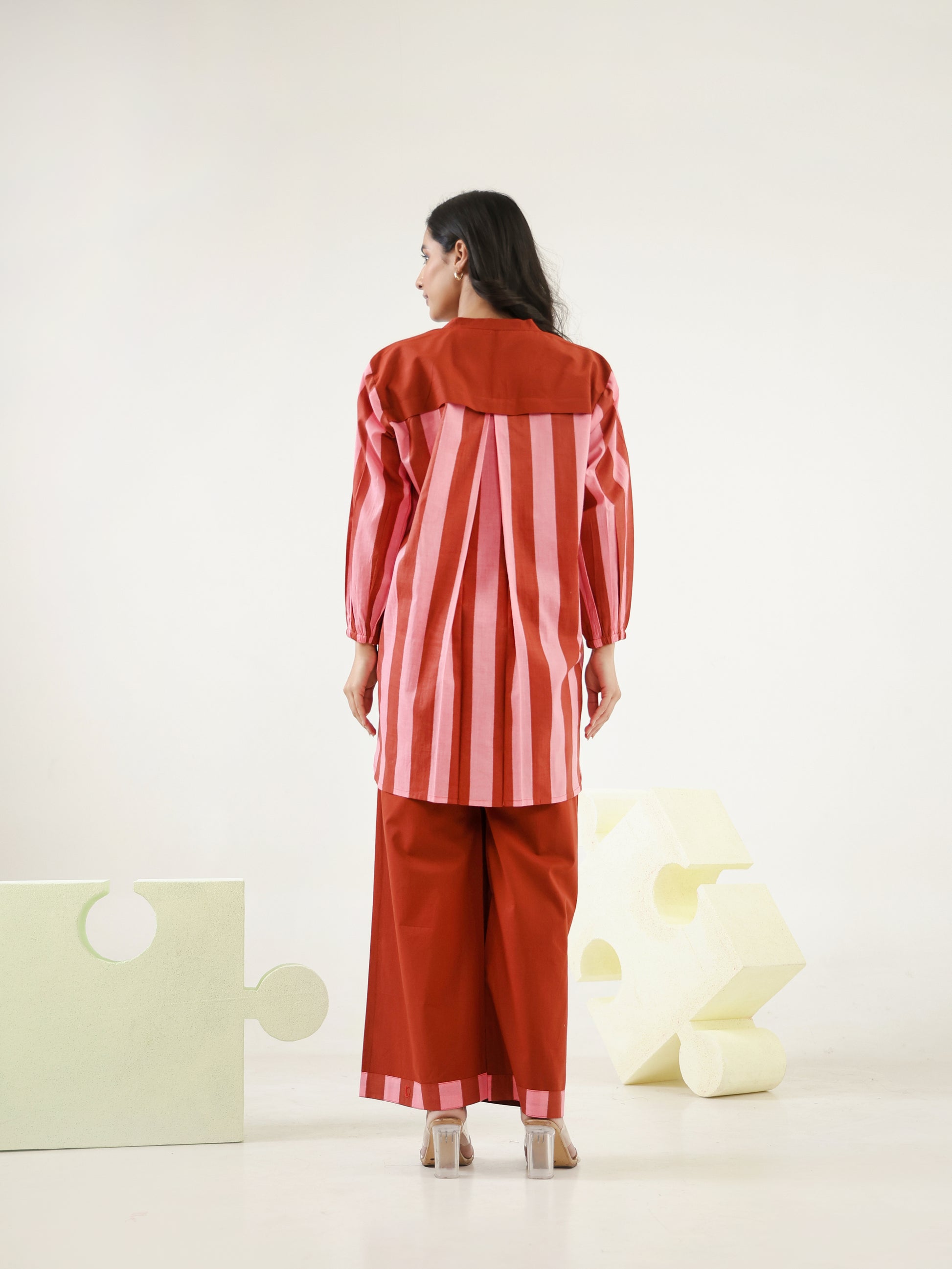 Designed in soft blushberry tones, this cotton co-ord set features top with a structured collared neckline, complemented by straight-fit pants in warm tonal hues, the set balances timeless design with modern comfort.
