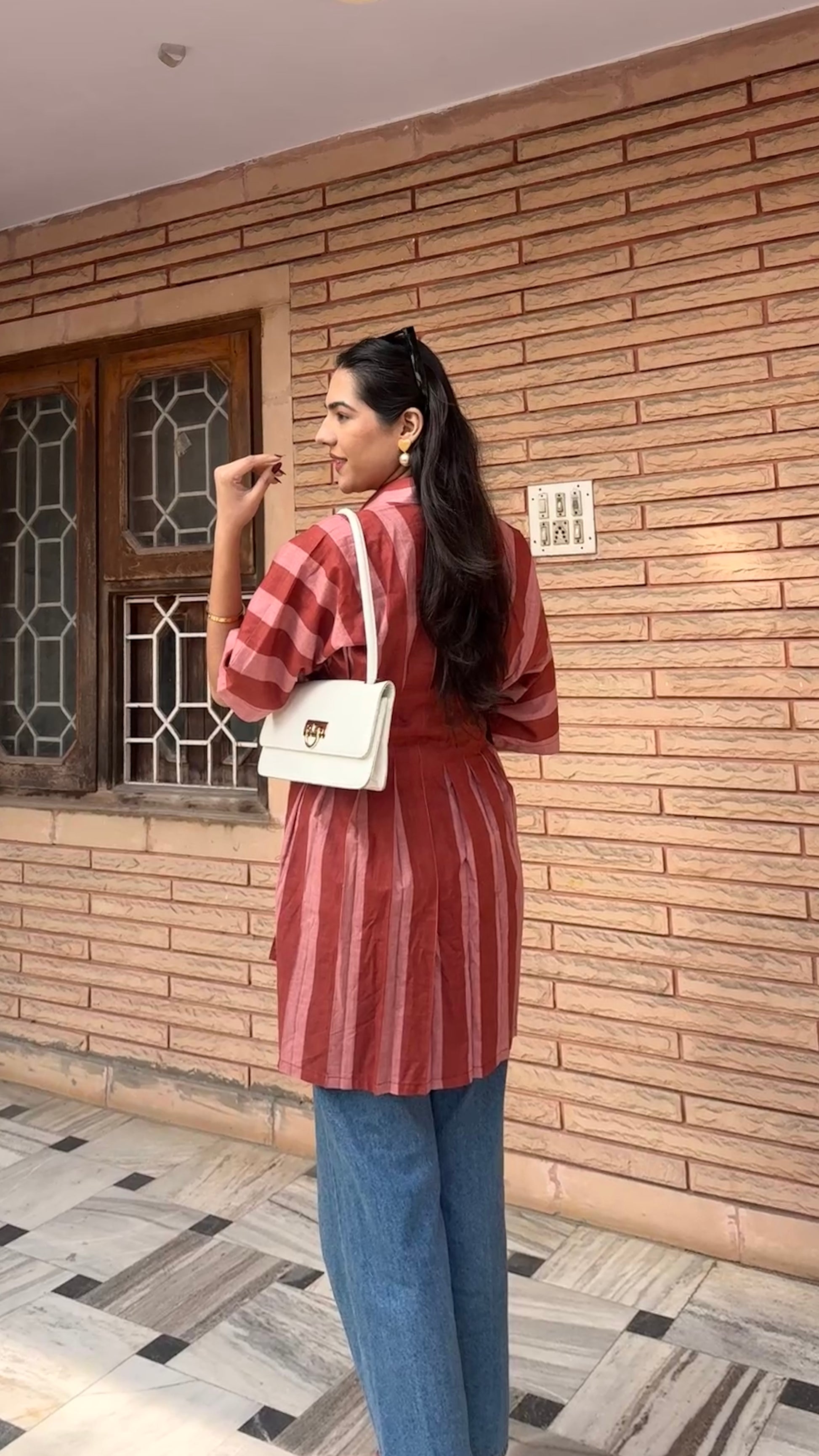 Refresh your daily style with this striped shirt in warm tones. Designed with breathable fabric, vertical stripes, and a flattering waist detailing.