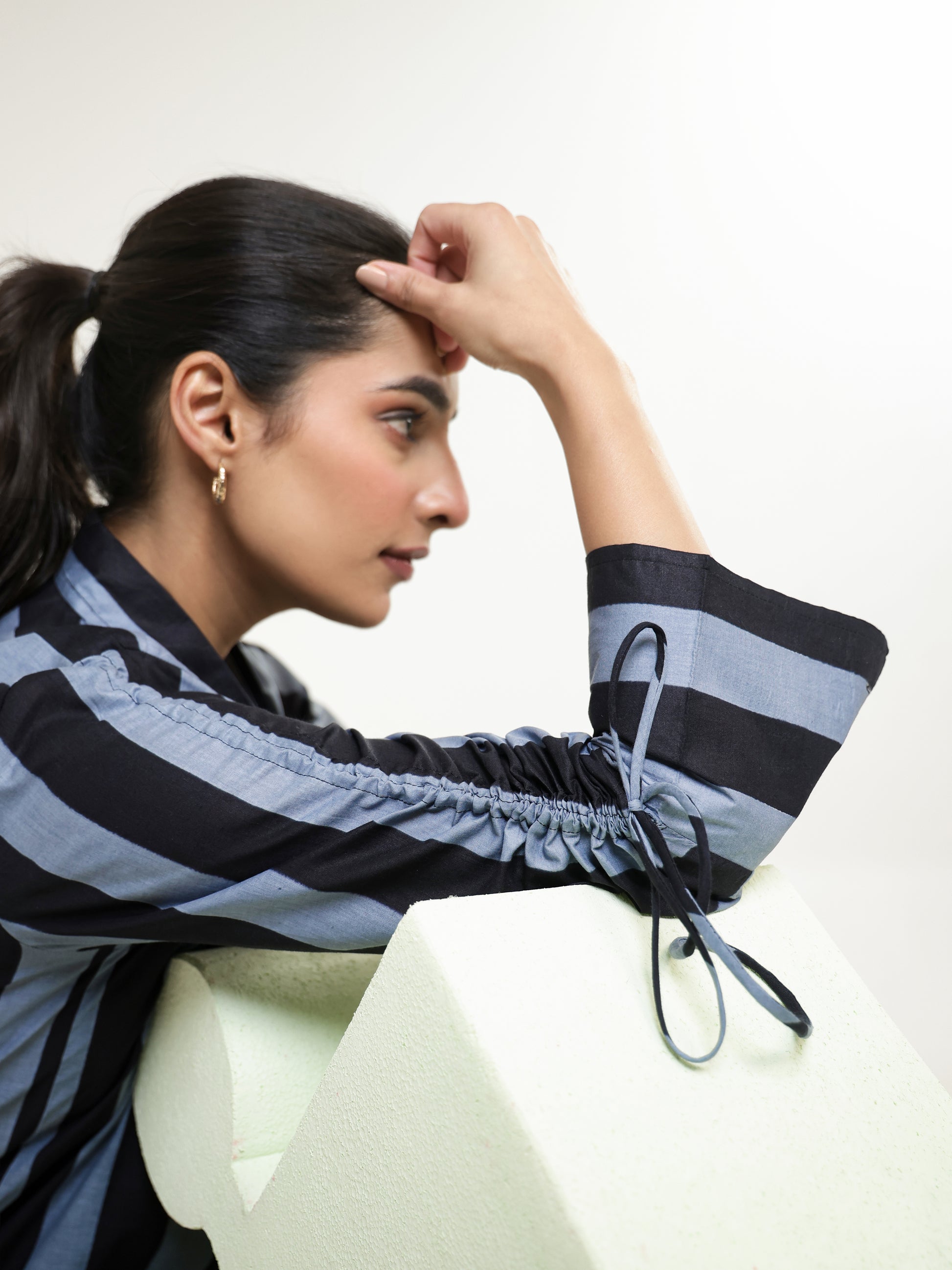 Designed in bold vertical stripes, this cotton co-ord set features a relaxed tunic-style top with full sleeves and subtle tie-up detailing at the cuffs. Paired with fluid pants, the set blends effortless comfort with modern sophistication.