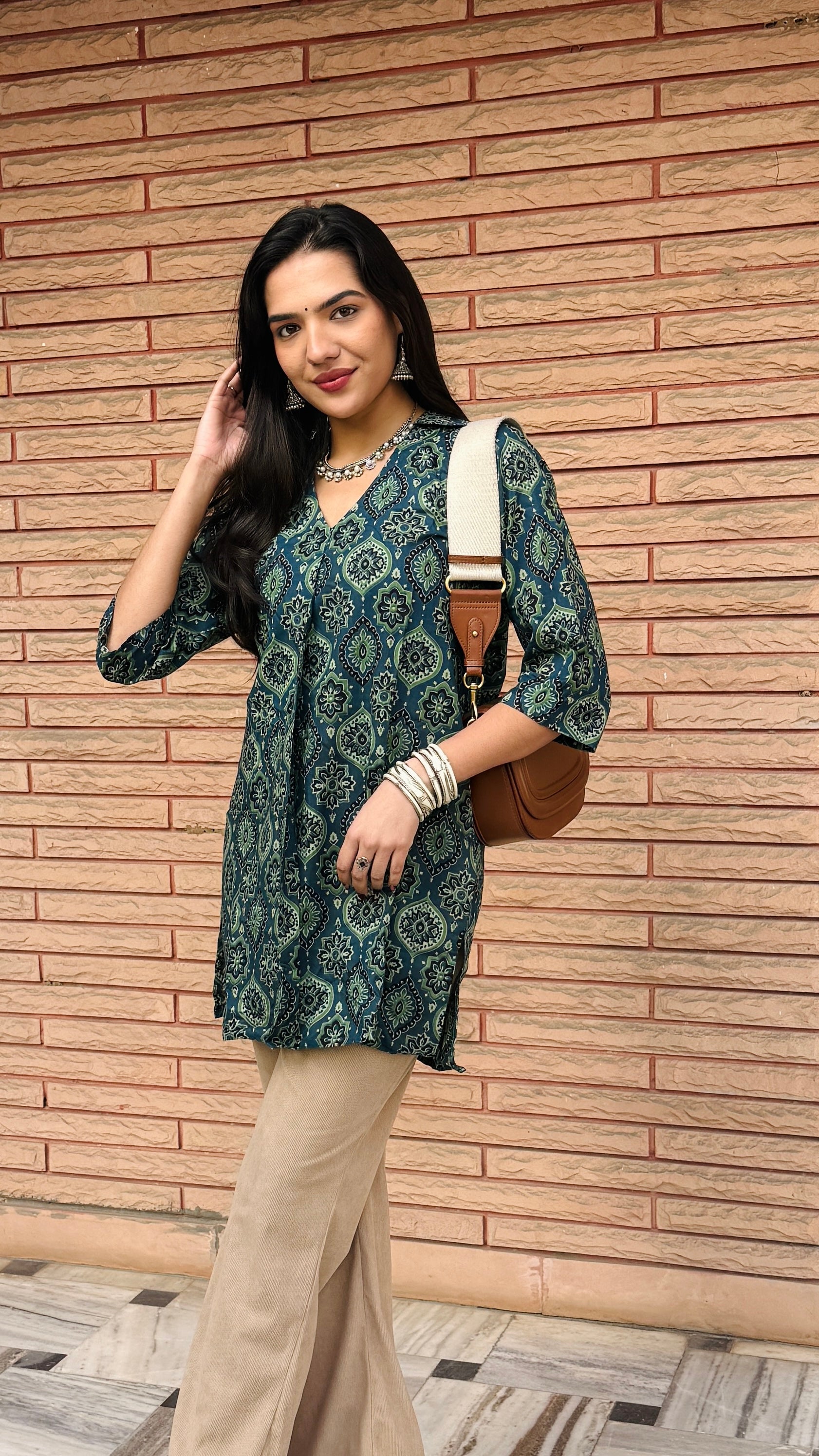 Elevate your style with this short kurta-style V-neck top, featuring intricate dark green prints for a chic ethnic look.