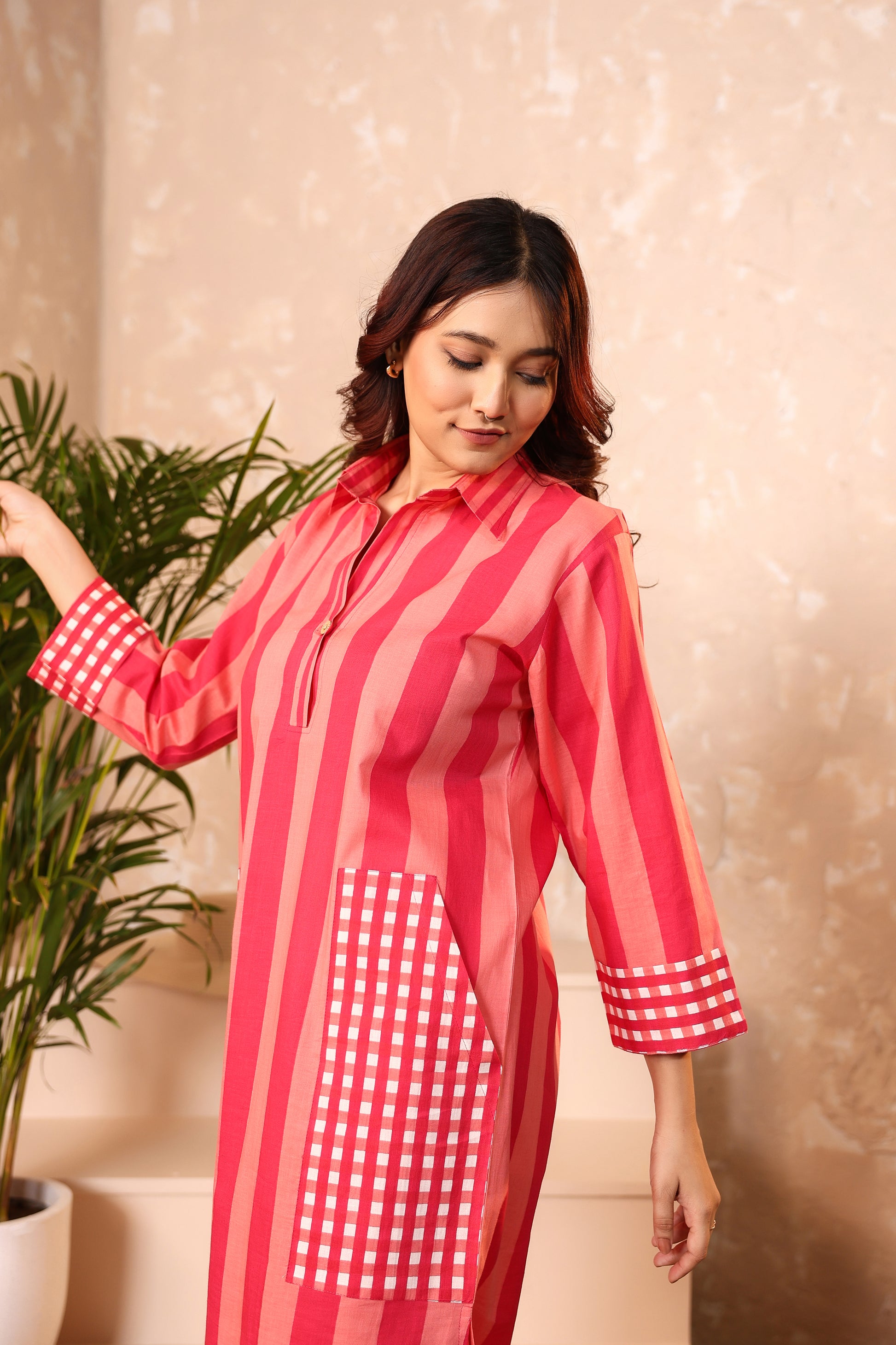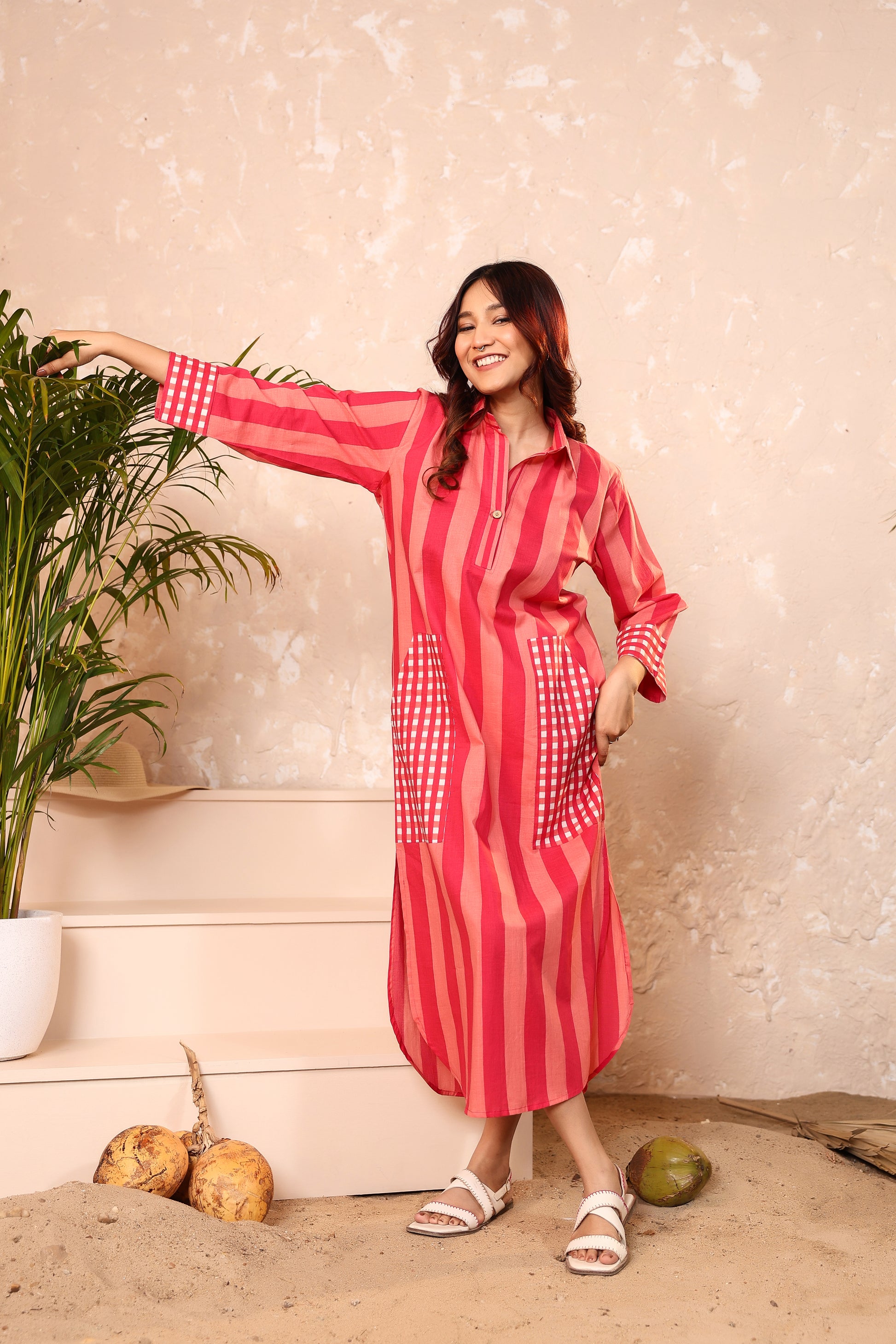 A vibrant fusion of modern edge and playful charm. Crafted in bold vertical stripes across varying shades of pink and red, this longline dress is designed to flatter while bringing a burst of color to your wardrobe.
