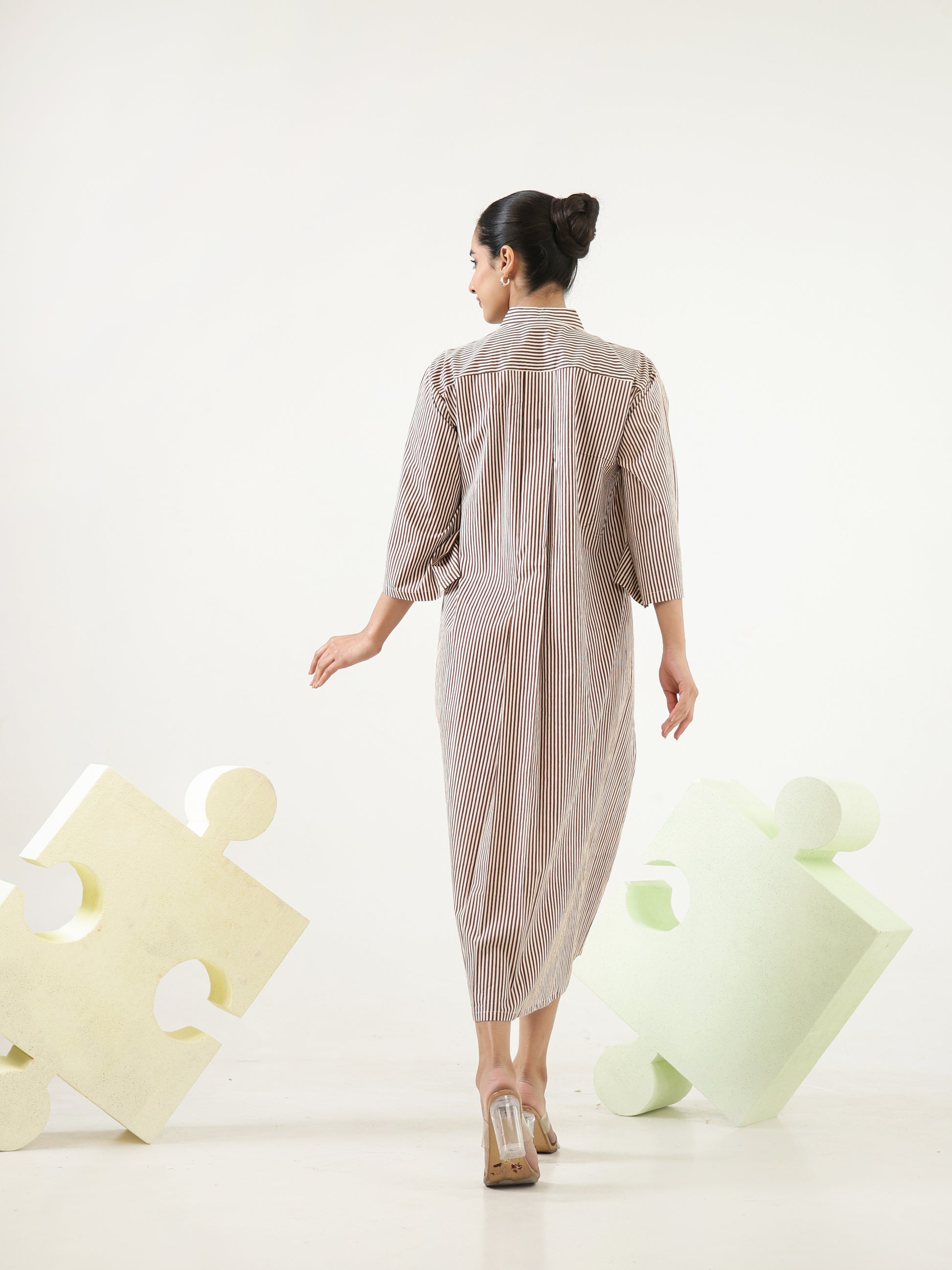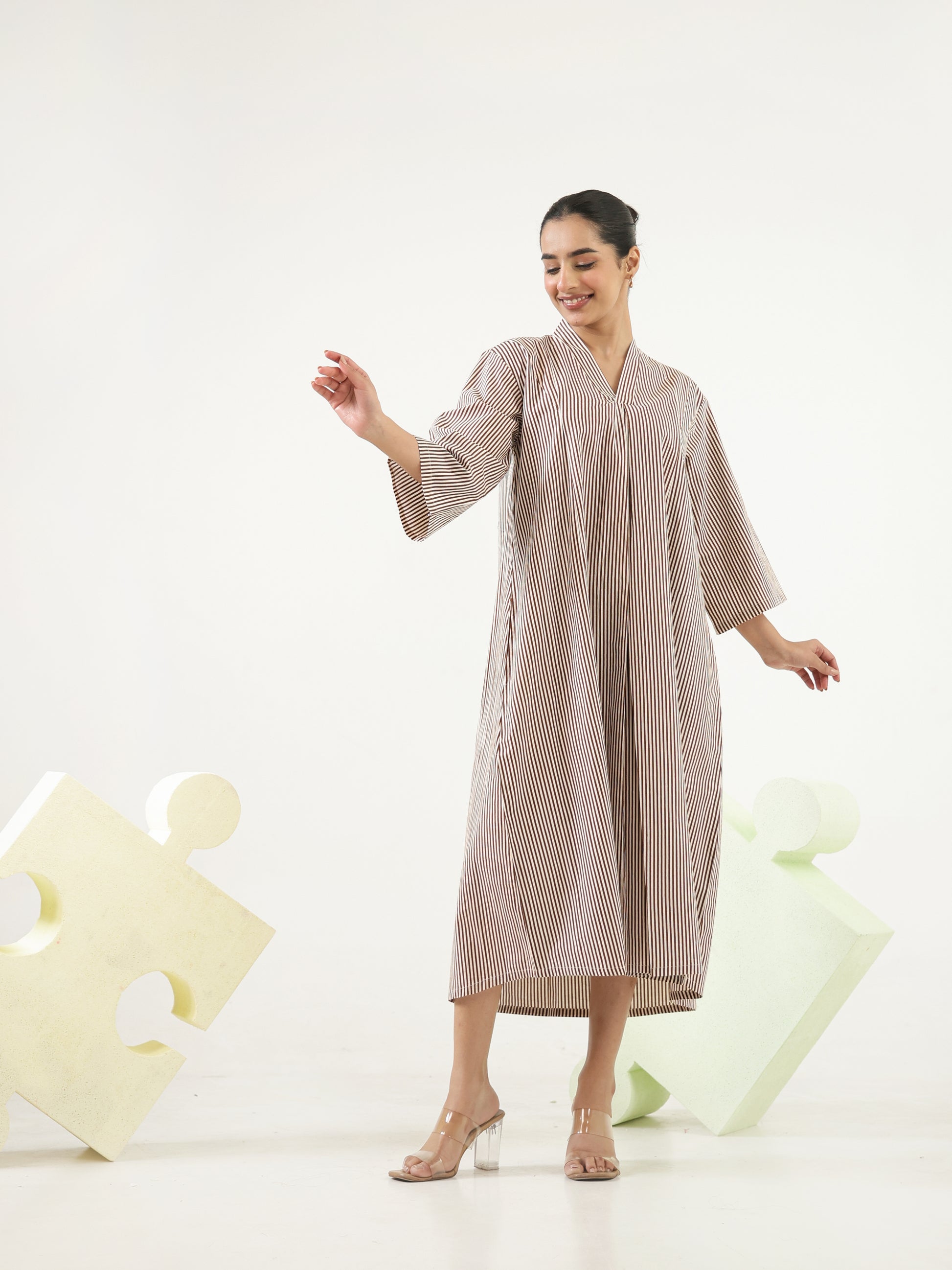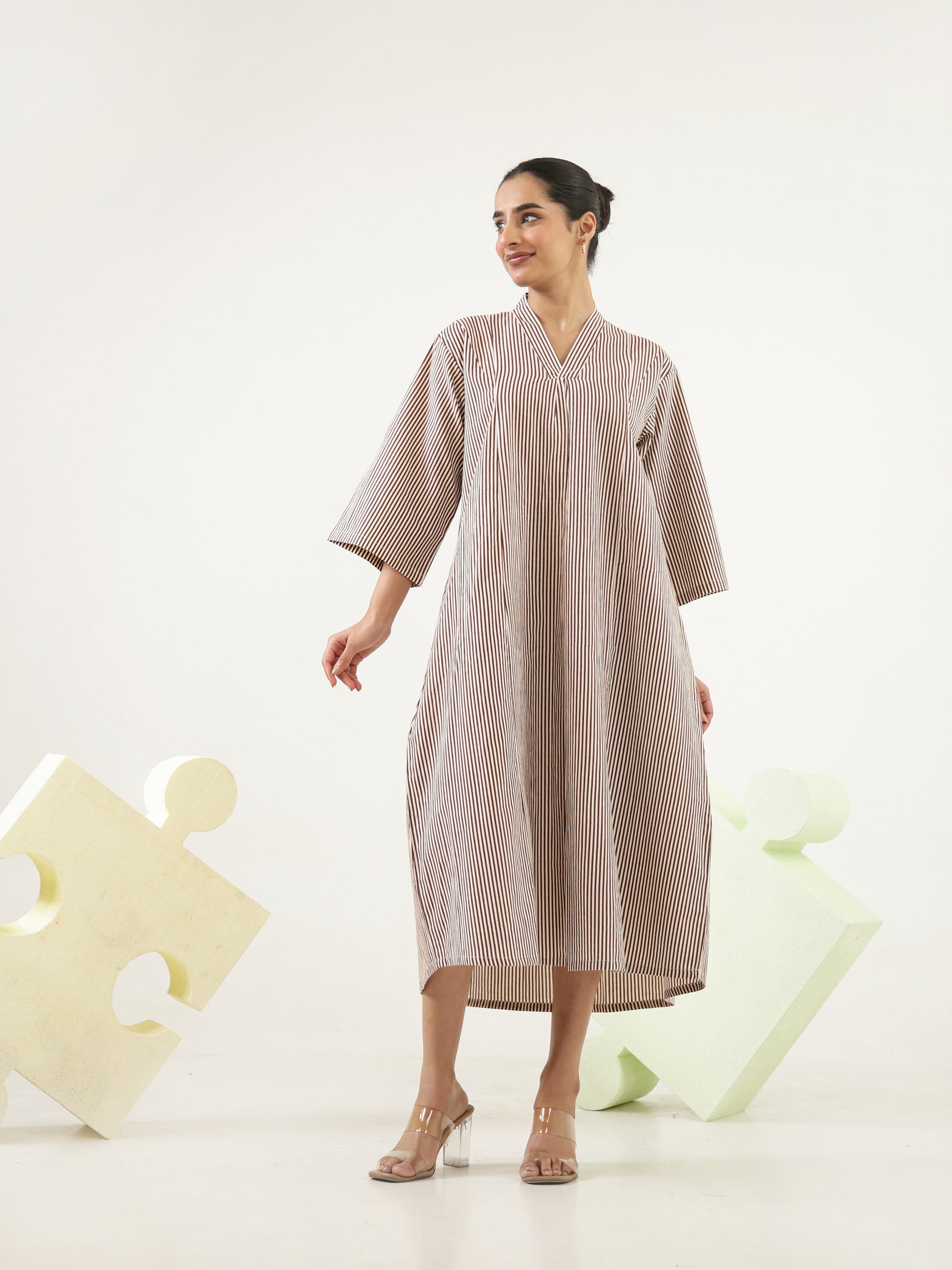 Designed in a soft brown and white fine-striped pattern, this midi-length dress features a flattering V neckline creating a clean and elongated silhouette. Finished with a relaxed fit the design blends natural tones with timeless lines for an effortlessly modern look.