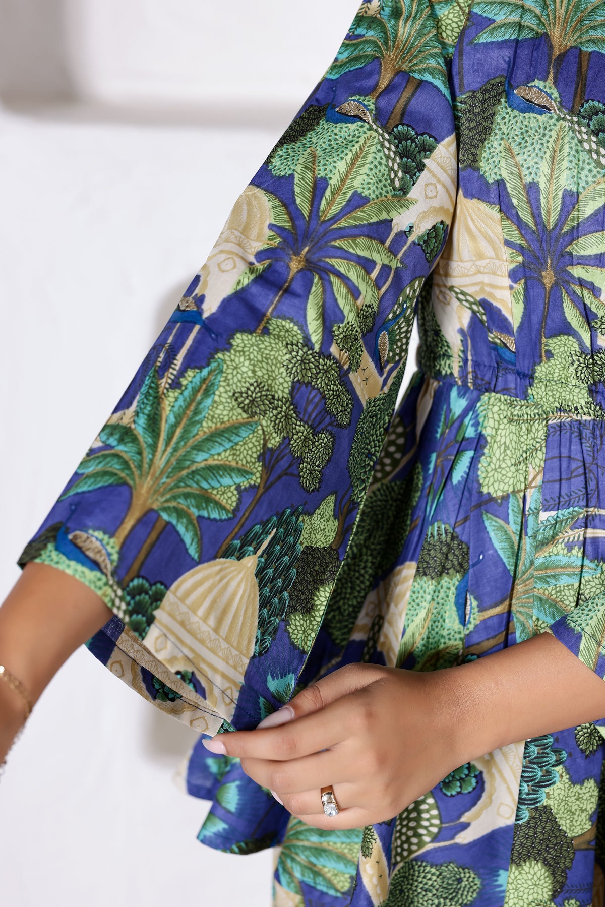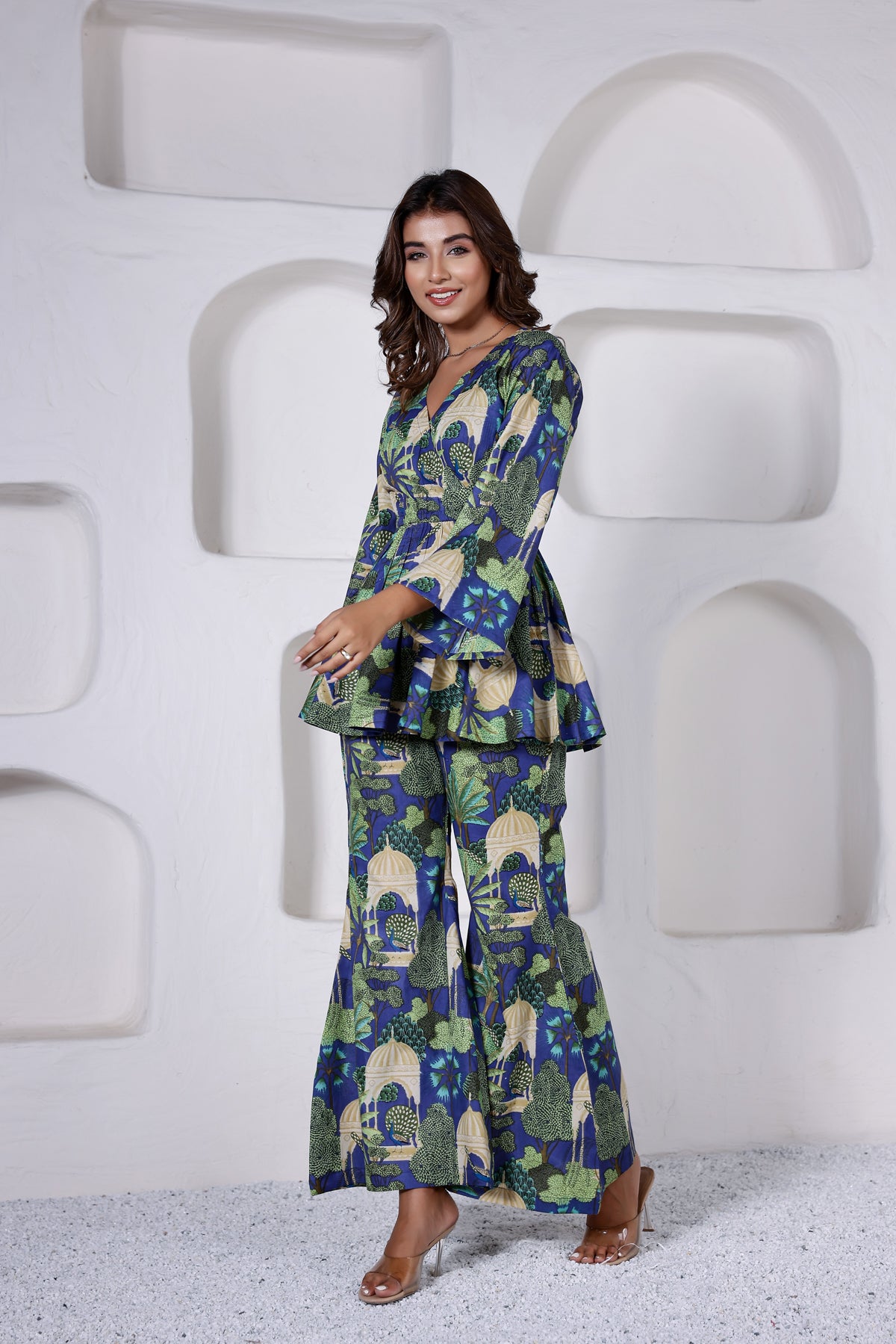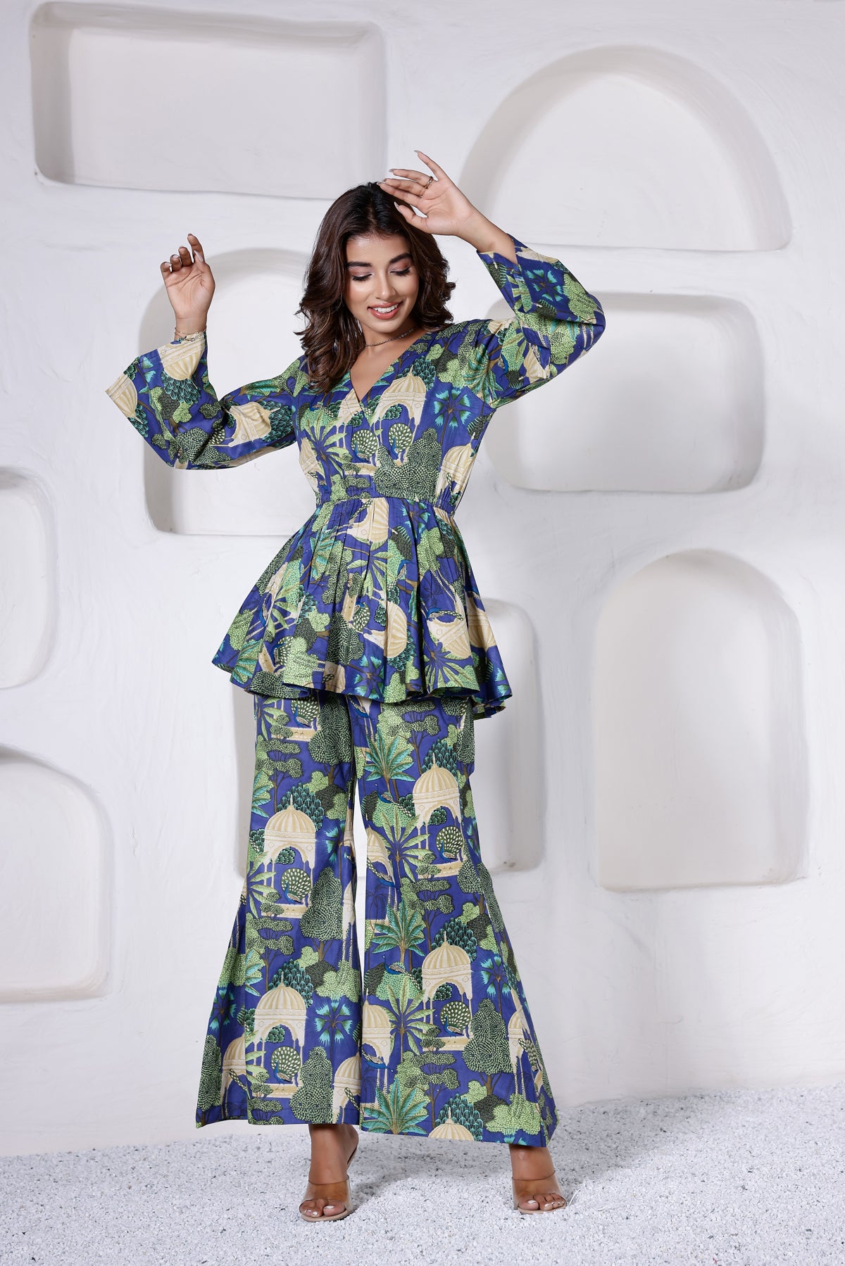 The Courtyard coord set is beyond their aesthetic appeal, and often prioritize comfort. This Set includes top comes with V neck detailed with elastic on waist and same print flared bottom with two pockets.