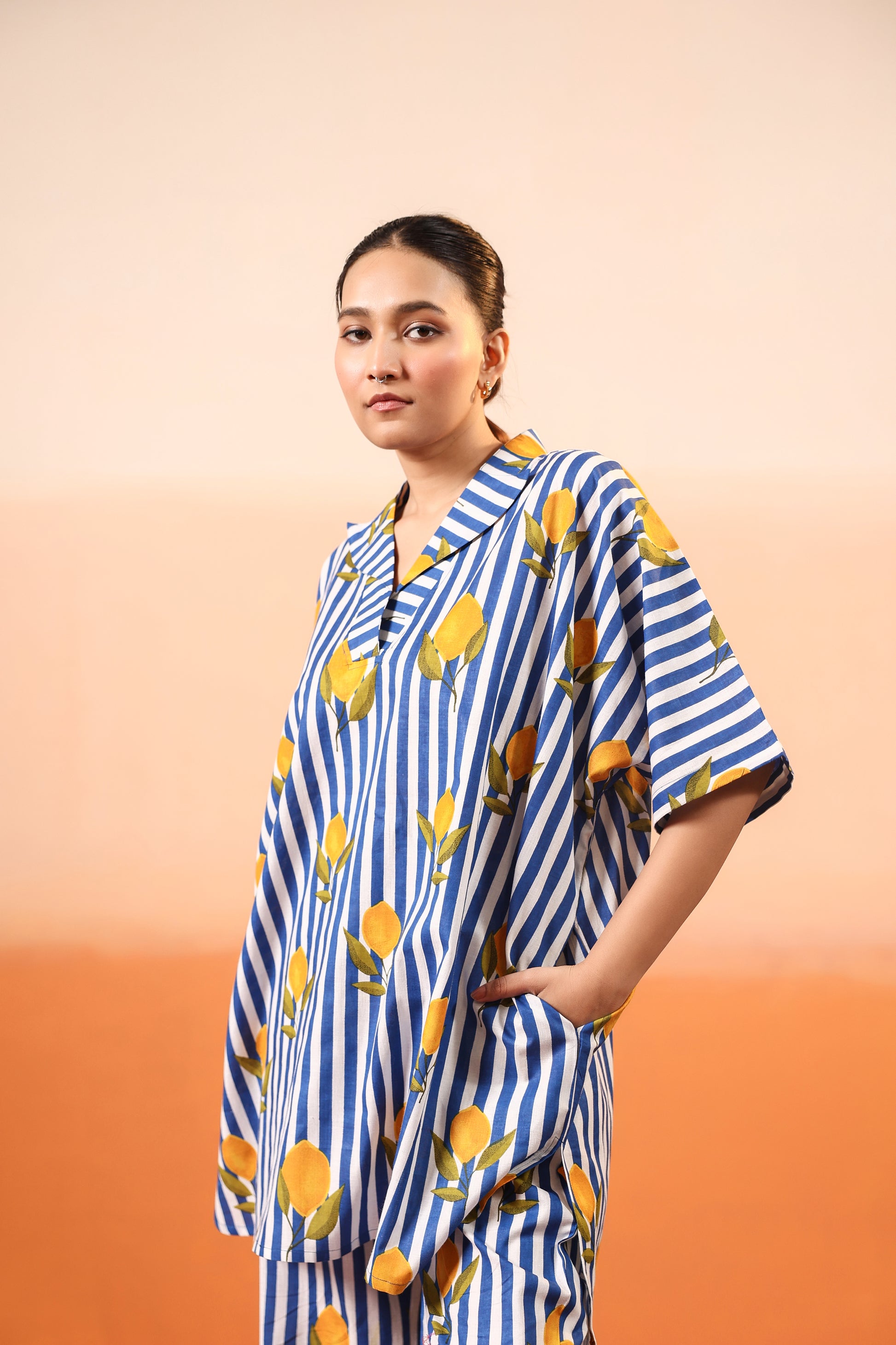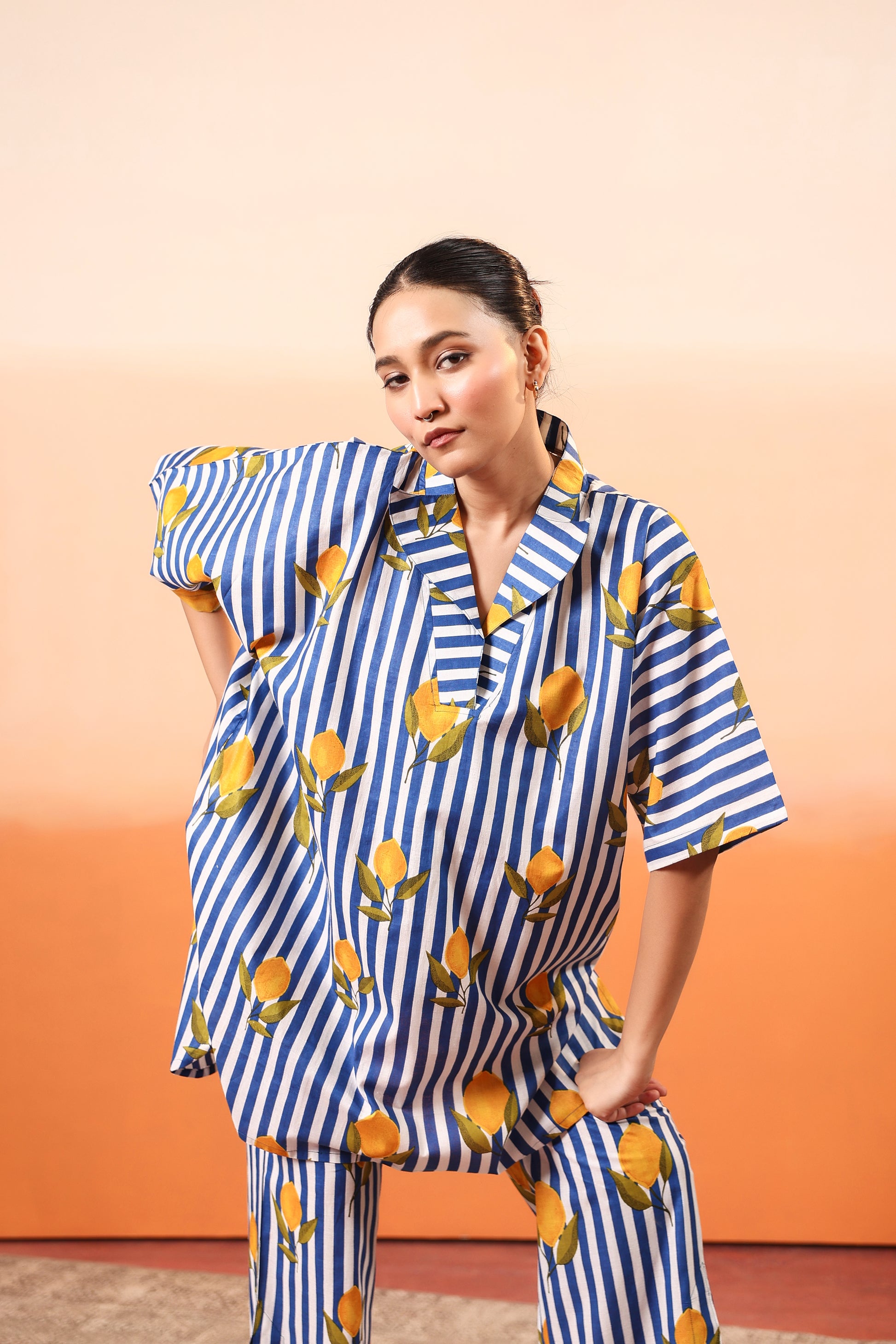 Featuring classic navy-blue vertical stripes decorated with vibrant yellow lemon motifs, this outfit is refreshing. The set includes an oversized V-neck top with short sleeves and easy movement, paired with matching relaxed-fit trousers for ultimate comfort and flair.